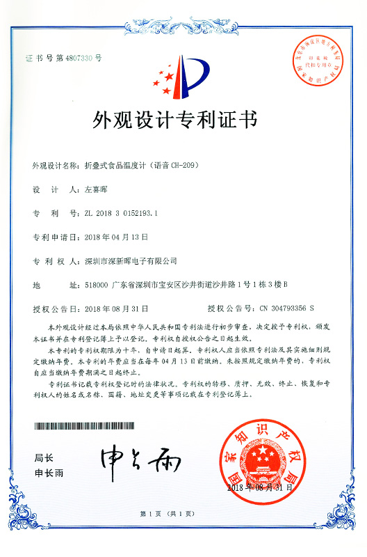公司表示,能夠成功取得美國外觀專利的授權,充分提現了:"CENTURY HARVEST世紀怡豐“品牌系列產品在家居用品電子溫度計類的設計、研發和創新能力,有利于提高公司品牌的知名度,進一步完善公司知識產權保護體系,增強核心競爭力。